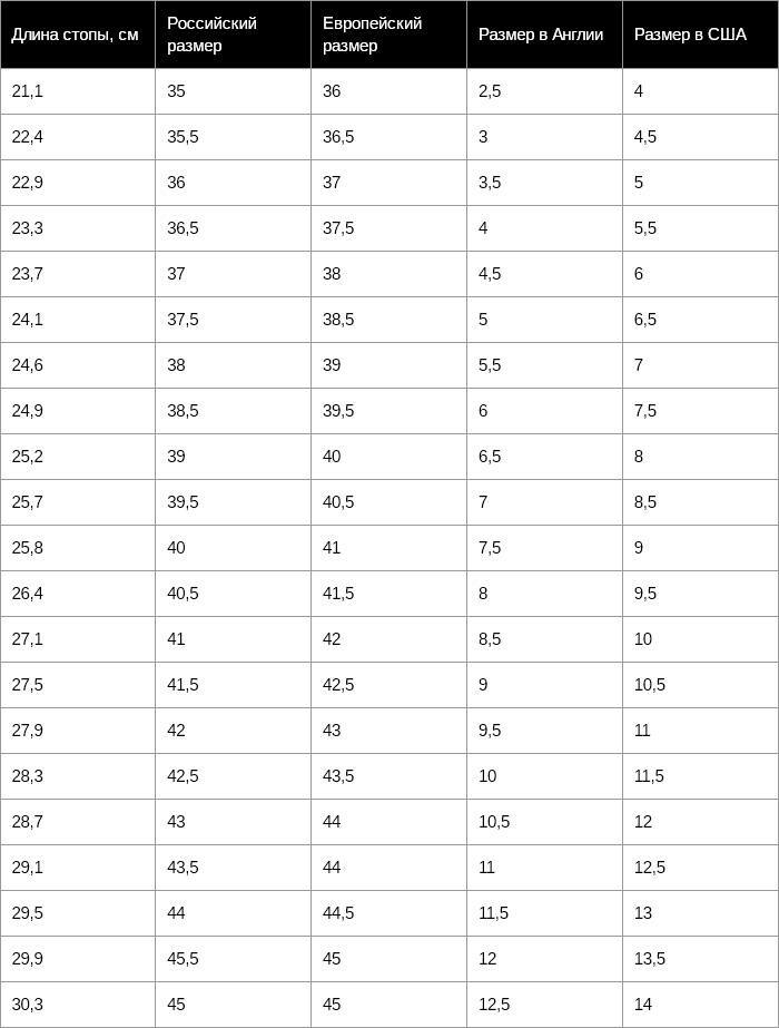 Измерьте Вашу стопу в см и выберите соответствующий размер в таблице. При выборе размера по сантиметрам необходимо отдавать предпотчение большему размеру.
